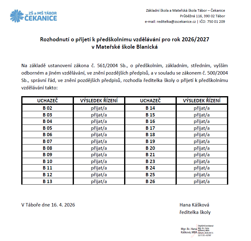 Seznam přijatých dětí k předškolnímu vzdělávání 2026/2027